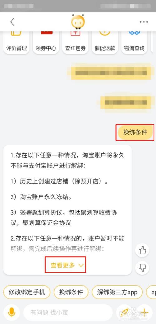 在对话框中输入“换绑条件”,在回复的信息中选择“查看更多”。