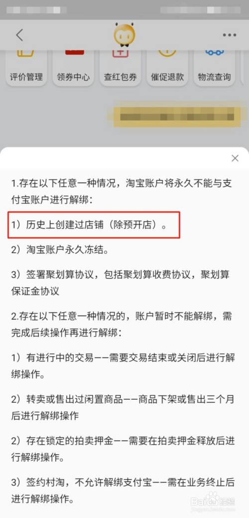 如下截图,对于历史上创建过店铺(除预开店),淘宝账户将永久不能与支付宝账户进行解绑。
