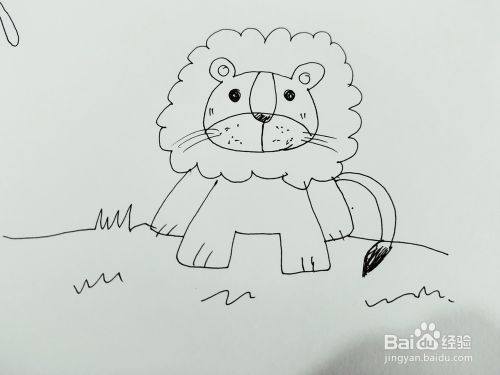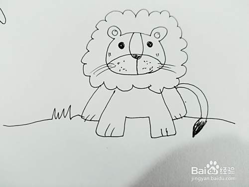 第七步,我们来画卡通狮子的尾巴部分。还有狮子下方的土地线条。如下图