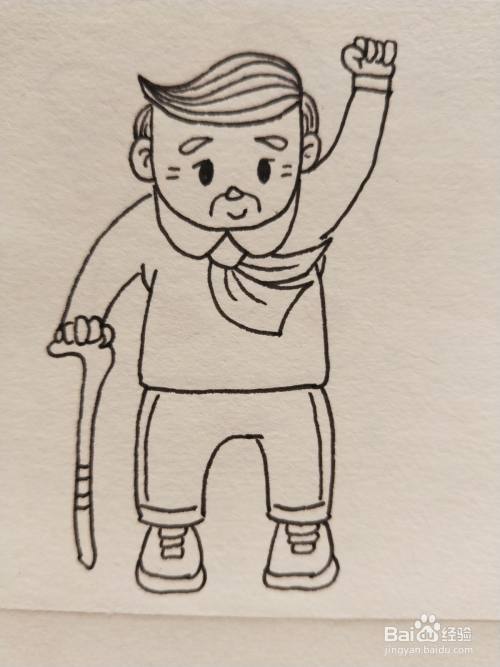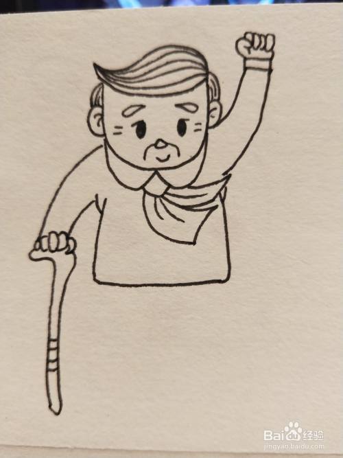画出爸爸的身体和手部,在左边手上画出他拄着的拐杖。
