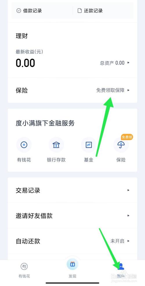 打开有钱花APP,在账户页面,点击保险—免费领取保障。