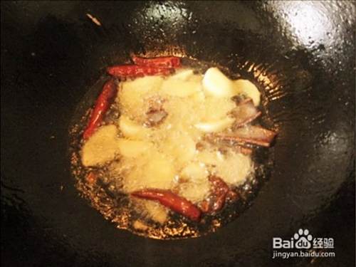 将生姜切片,辣椒切段,大蒜头整个。起锅放油(多些)将姜、蒜、辣椒放了油锅里炸出香味。