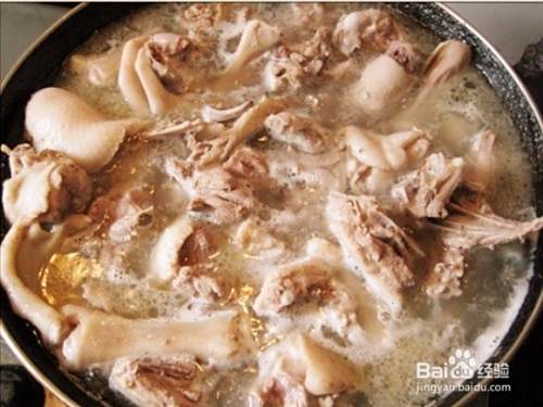将鹅切成大块,起锅,放入大半锅清水,烧开后将鹅块放开水里绰一下,然后捞出沥干水分。