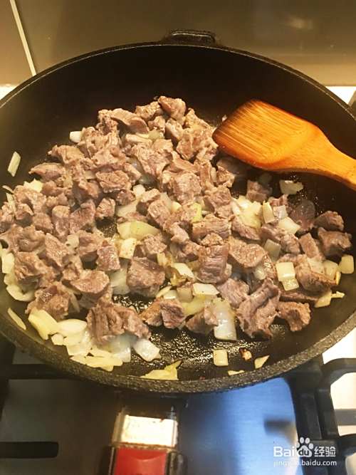 牛肉冷水汆烫后,一定热水冲洗干净。用平底锅热油把一半洋葱丁爆香,放入牛肉翻炒,再放入现磨好的黑胡椒粗粉,注意不要炒干了
