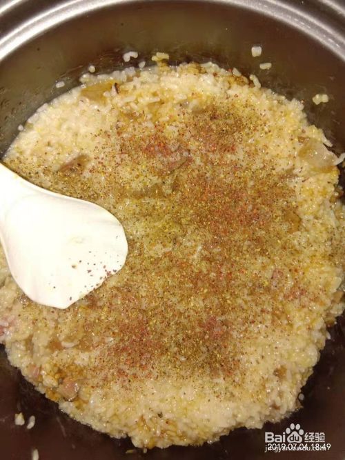 其次,糯米清洗干净装进锅里,倒入切好的腊肉丁加上盐、鸡精和没过于腊肉丁的水开煮。