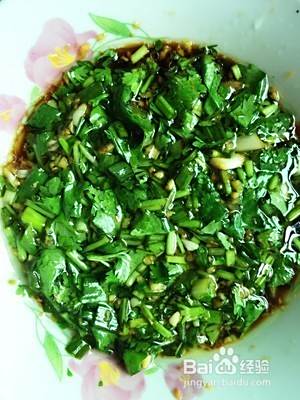 一把小葱和一把香菜洗干净切成小段,姜和蒜头剁成末状,把葱花香菜姜蒜一起放在调油碟加入酱油和香油搅拌,静放待蘸用。