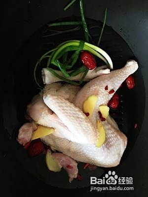 把鸡洗干净,一把小葱,若干姜片,若干枸杞和红枣,加入水差不多淹没过鸡。加入枸杞和红枣主要原因使汤更加鲜甜,这样既有好汤喝又有好肉吃。
