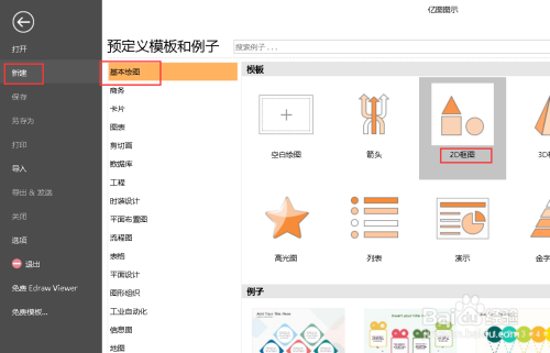 打开亿图图示专家,选择新建-基本绘图-2D框图,双击模版中的2d框图模版进图绘图区域