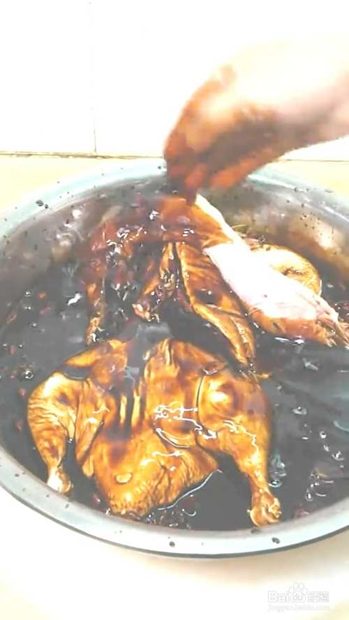 容器中放入鸭子。将鸭子浸泡在煮好的料水中。腌两天后捞出。挂在外面风干
