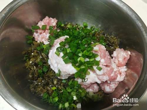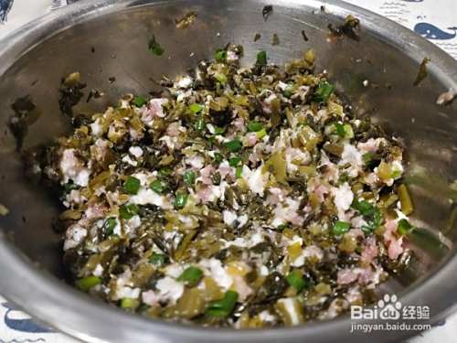 将腌菜,肉末和香葱倒入盆中,加入味精,胡椒混合;