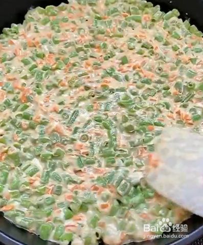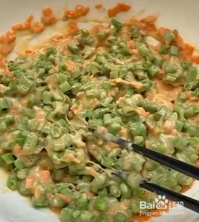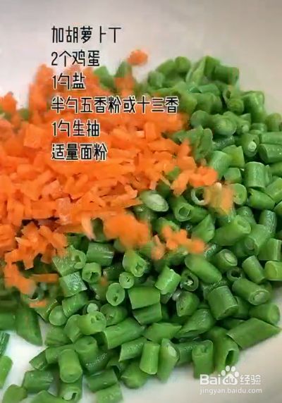 豆角蒸饼的做法下面图片上已经表述得很清楚了,先是把豆角加食盐和食用油,放入锅中焯水煮熟后捞出,切碎,加;胡萝卜、鸡蛋、食盐、五香粉、生抽酱油、面粉,搅拌均匀,然后铺在盘子里,上锅蒸熟出锅切块就可以吃了。吃的时候调制一碗蘸料,配方;生抽酱油20克、香醋20克、白糖5克、辣椒油20克。