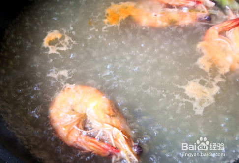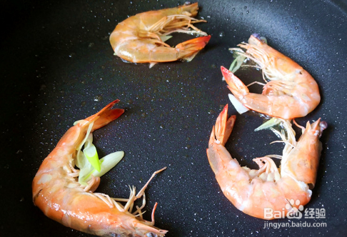 炒锅里放入适量的食用油,热锅凉油,油热放葱花爆香,再放大虾入锅翻炒出香味,这一步很关键,大虾翻炒后再煮汤,汤汁呈白色,很鲜美,