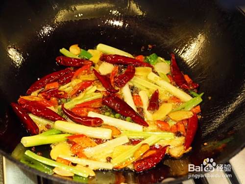 锅中下油,加入青椒,干辣椒,麻椒,大火翻炒出香味