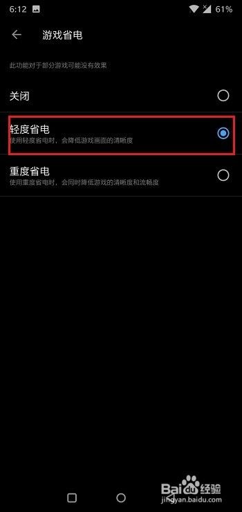 第五步我们可以点击游戏省电进去看一下,如果对游戏画质要求不怎么高的,可以选择轻微省电,要求清晰度高的,可以将游戏省电关闭,如下图所示: