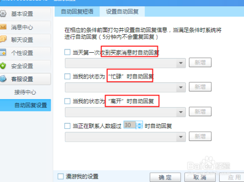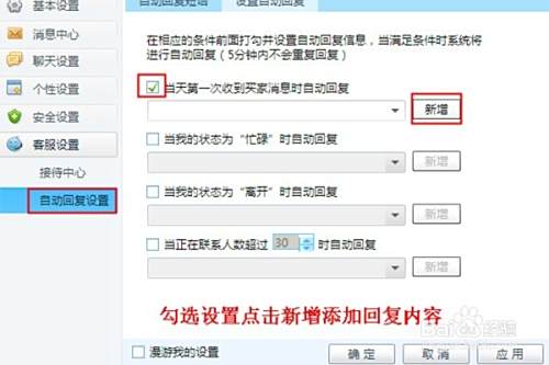 接下来点击自动回复设置,勾选要新增的选项,添加内容