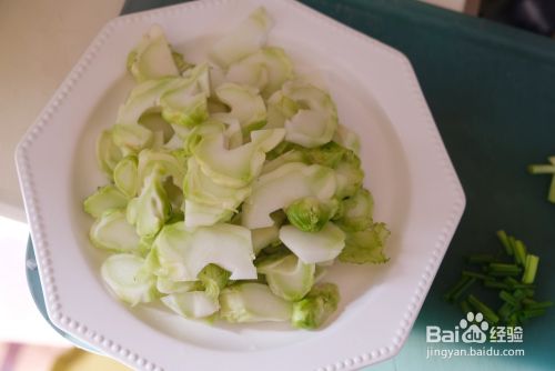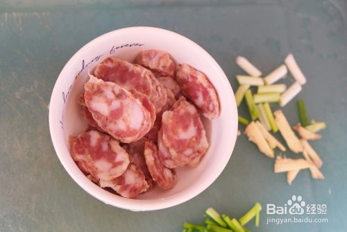 麻辣肠泡过洗净后,切片。小葱切段,姜丝切好