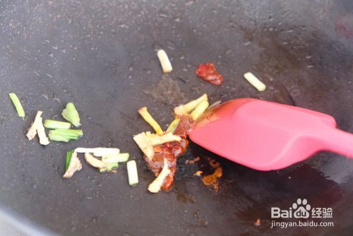 锅里再加点油,下葱白,姜丝,一勺豆瓣酱,炒香