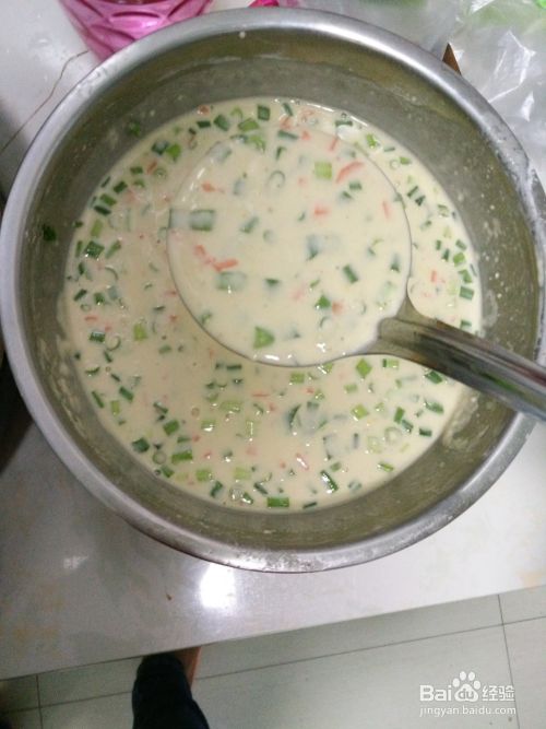 等到油热了以后,拿勺子盛搅拌好的食材,均匀的铺在锅底