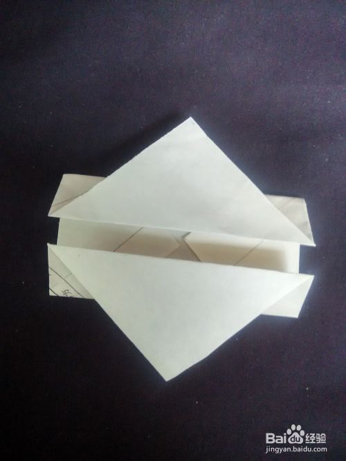 然后将下边折到上边。然后将右下角折到上面,对准中心线,折一个三角形。然后翻过来,对准中心线,再折一个三角形。然后,将三角形压成两个正方形。