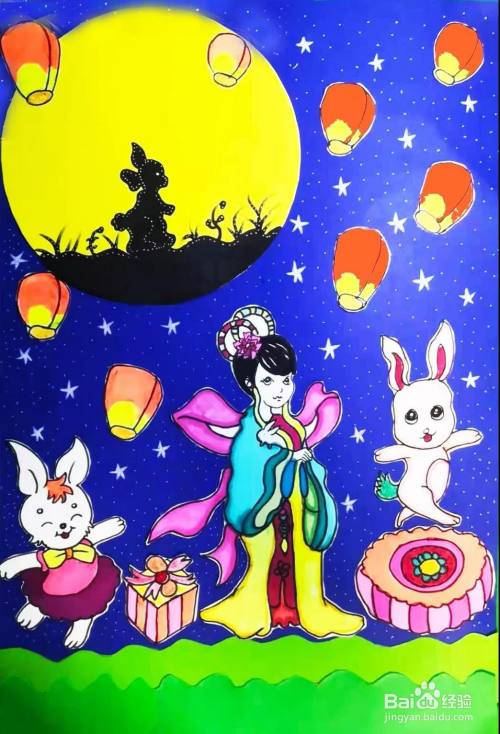 接着画出图中的嫦娥、兔子、月饼等图案。