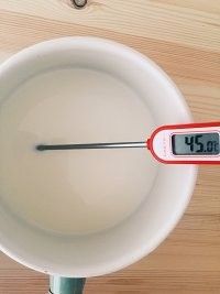 于是把淡奶油和牛奶按上面算出分量称量出,混合倒入奶锅中小火加热至45度左右
