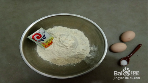 做油饼之前,就是要先准备好食材,面粉300克,鸡蛋2个,适量的盐和3克的叫酵母粉。