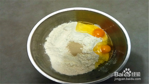 将面粉倒入盆中,然后放入酵母粉,再放入食盐,打入一个鸡蛋,搅拌均匀。