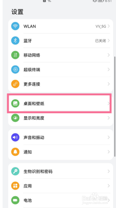 1、在手机设置菜单中点击【桌面和壁纸】。