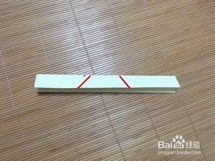 此时将纸条的开口向下,沿红线位置折起来,注意,两条红线的中间不要太宽,上短边大概1厘米多点,效果如图