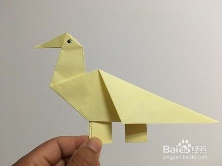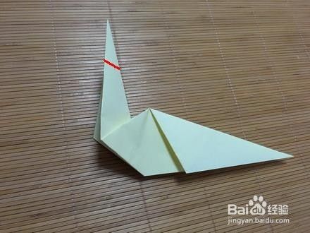 这一步是折恐龙的头部,手法跟折脖子的手法类似,沿红线位置向下、向里面折起。这样恐龙的身体部分就折好了噢。