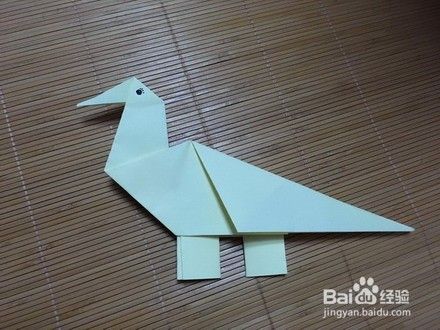 将剪好后的恐龙脚插进恐龙的身体(注意是插进去,因为刚才恐龙身体折时候下口刚好有个开口),如果想要牢固一点,可以在脚上方的那个梯形位置上点脱水或者双面胶。然后给恐龙画上眼睛就OK了。一只可爱的小恐龙折纸就做好了,怎么样,非常的简单吧。