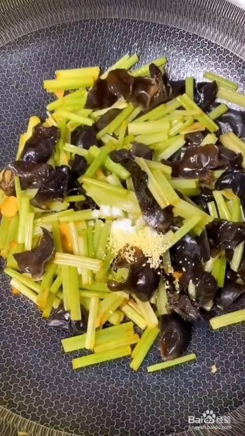 加入芹菜,炒出香气,放入酱油,放入木耳,加入盐,鸡精,加入鸡蛋,加入红椒段。