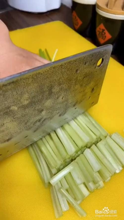 准备芹菜切断,碗中打入鸡蛋,用筷子搅散,油热炒鸡蛋。起锅烧油,葱爆香。