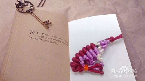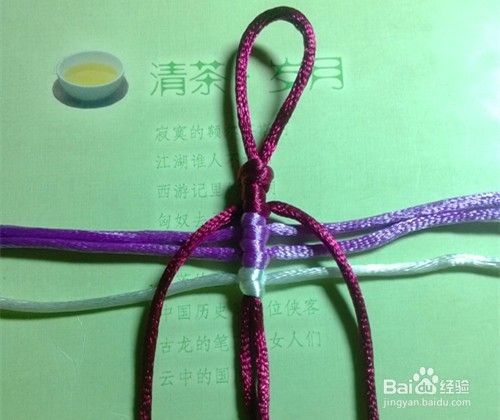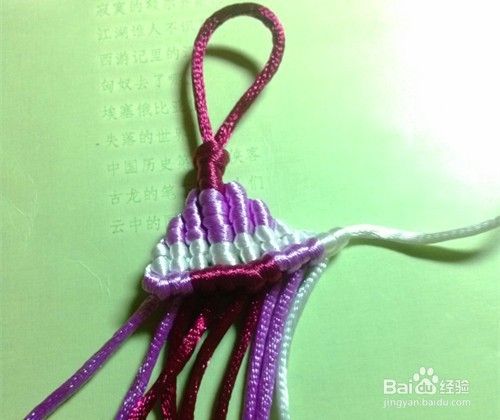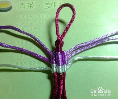 取一根枣红色线对折打双联结;然后将其余四根线依次往上编斜卷结。