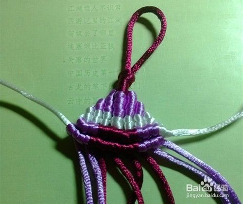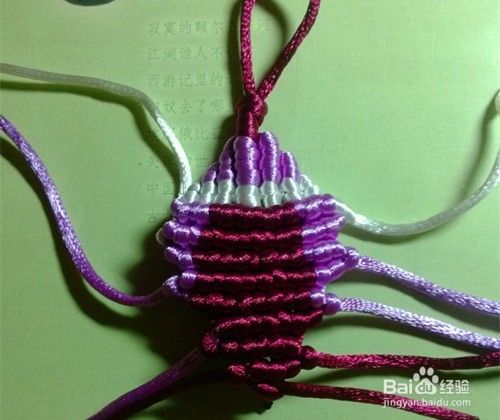 将左边的白线横着往右边拉当轴线,其余线往上编斜卷结。