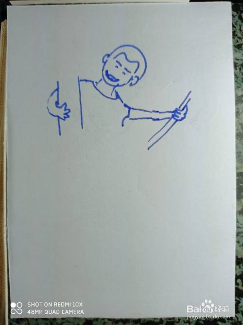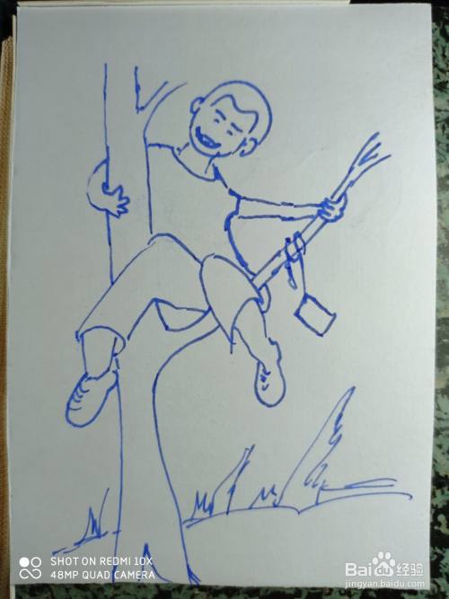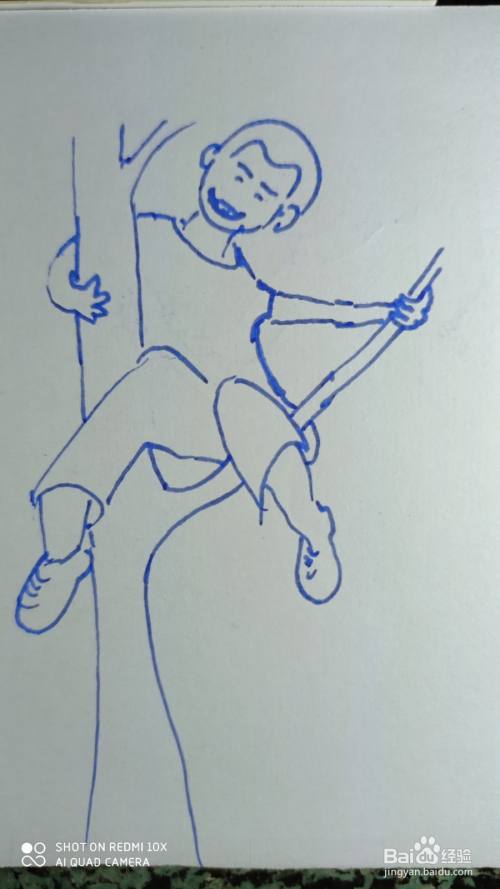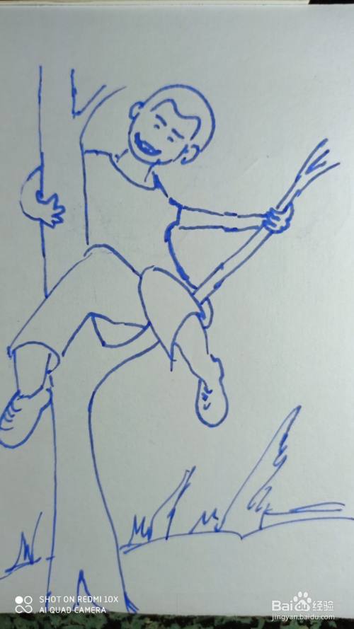 用曲线和弧线画出小男孩的头部轮廓,并且画出他的五官部分,再用弧线画出他的身体和胳膊,他用手正抓着树干和树枝。