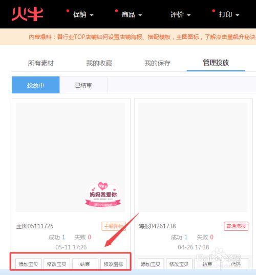 确认图标 修改好以后,点击页面右上角【保存】按钮,保存当前图标。保存成功以后会弹出提示窗口,在火牛提示窗口点击【去投放】按钮,筛选宝贝投放主图图标就可以了。