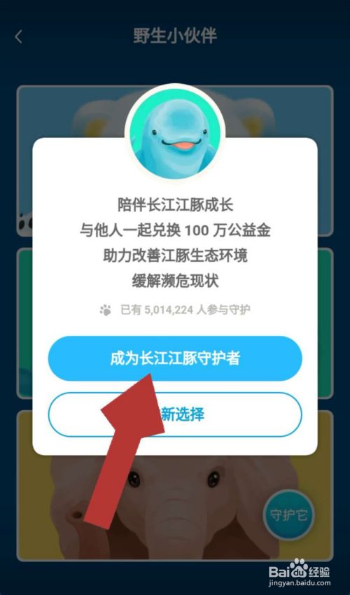 进入野生小伙伴选择页面,点击我们想要守护的小伙伴后方的“守护它”,选好后,再点击“成为长江江豚守护者”。