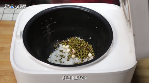 将淘洗好的大米、芡实和泡好的绿豆倒进电饭锅中。