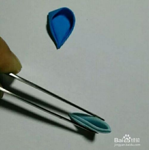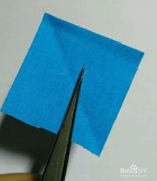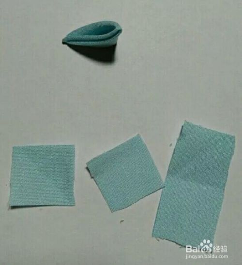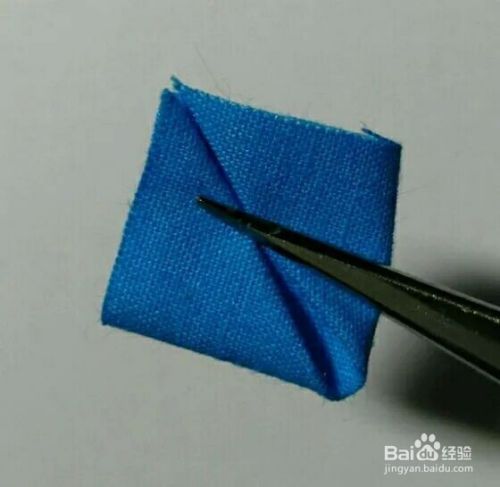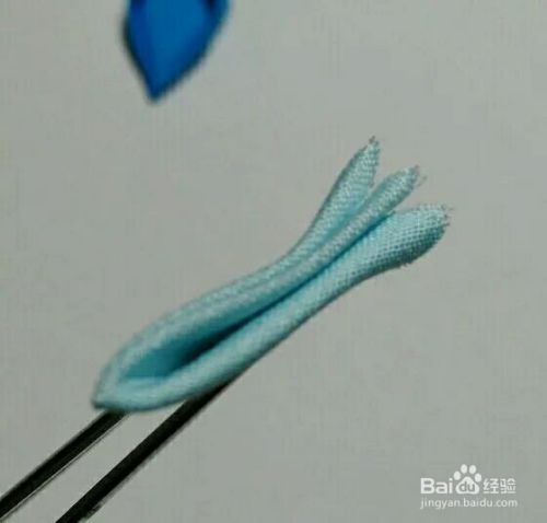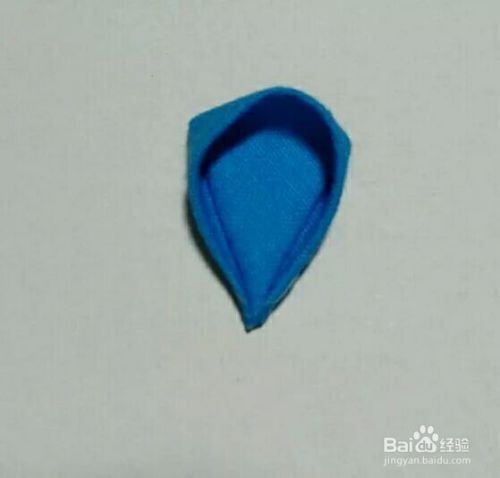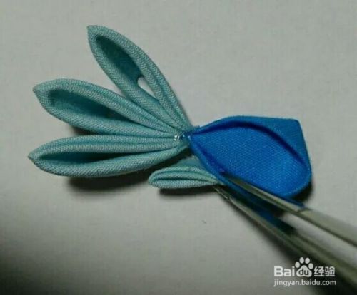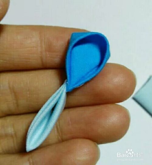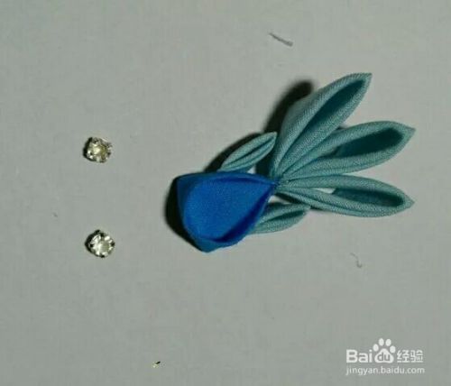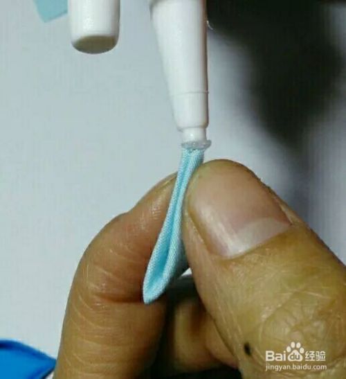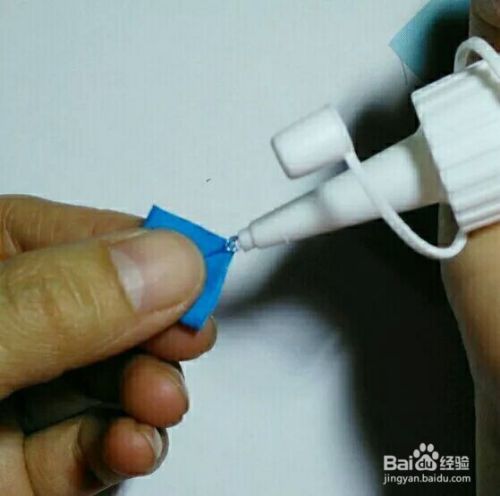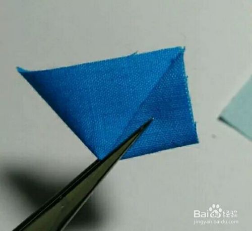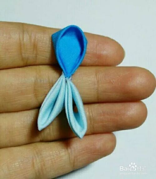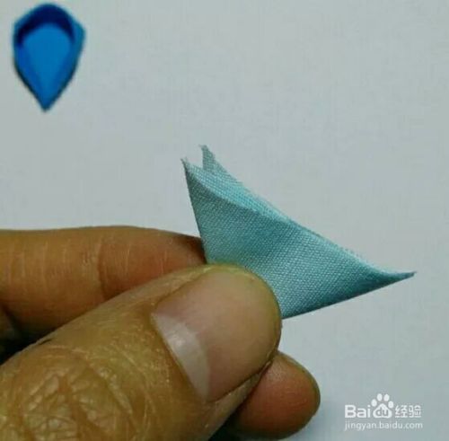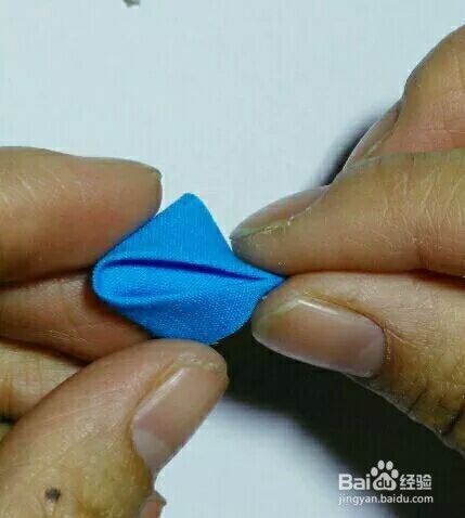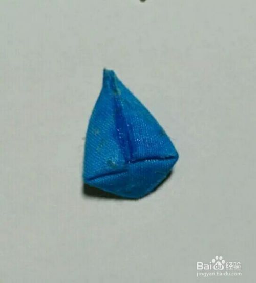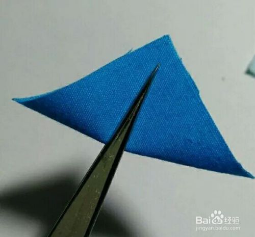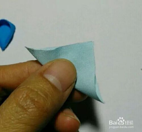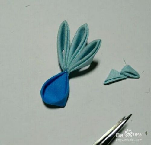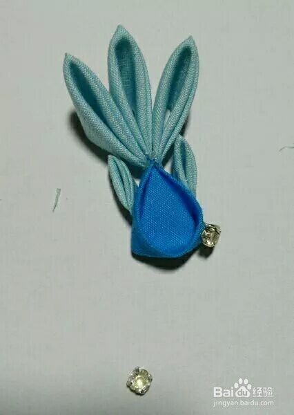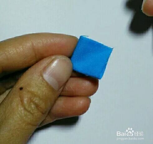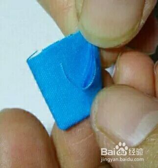接下来就是小尾巴的作法。拿了浅蓝色的布,对折,对折,再对折,三连折后酒精胶粘好。