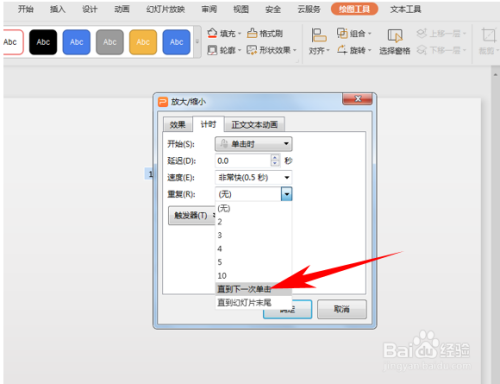 弹出放大/缩小的对话框,单击计时,在重复的下拉菜单下选择直到下一次单击。