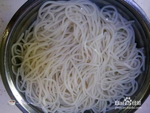锅里水烧开,加一点点盐,放入米粉,将米粉煮熟后立即捞入凉白开里过凉。