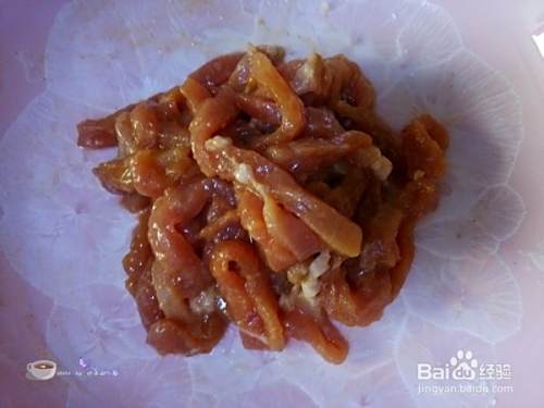 瘦肉切丝,加入少许黑胡椒粉、适量生抽、淀粉、香油抓匀。