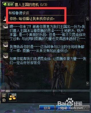 然后与哈伯福对话完胜前往任务,接受下一个任务:兽人王国的危机,找到格哈鲁与其聊天完成。