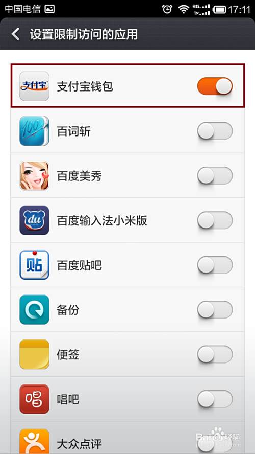 系统会列出你已经安装的应用,滑动应用后方的按钮,即可设置此应用为限制访问应用,如图所示.这样你就可以大大方方借出手机了.