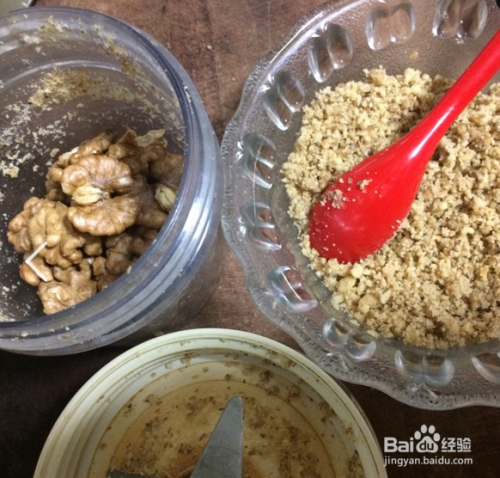 先将核桃仁烤箱180度烤15分钟,然后稍凉打碎。