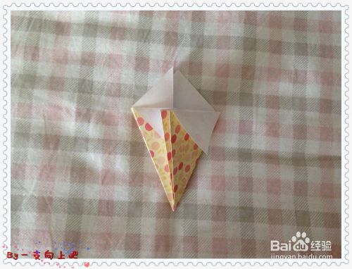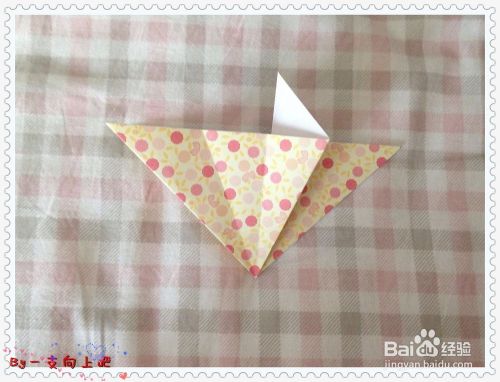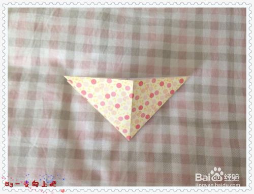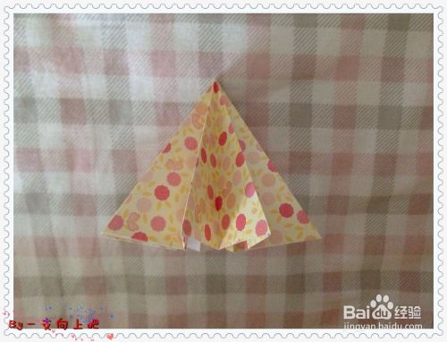 正对我们的三角形另一个角同样沿中线立起,打开后向下压,折法同第6步,如图示;
