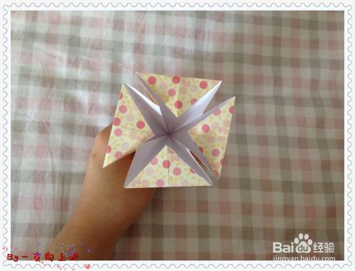 小正方形拉起一个角,把立起的部分打开并向下压,形成如图示的形状;