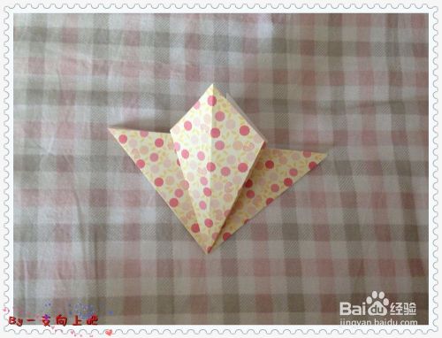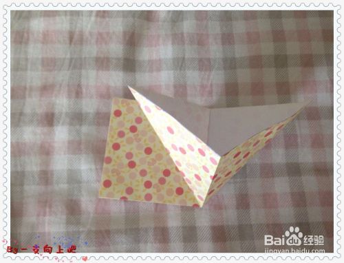 此时的正反面2个三角形共有4个角,我们取一个角沿中线立起,打开后向下压,如图示;