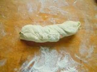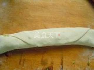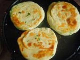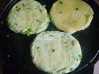 饼上面撒匀一勺植物油,一勺盐均匀撒开,加适量葱花。